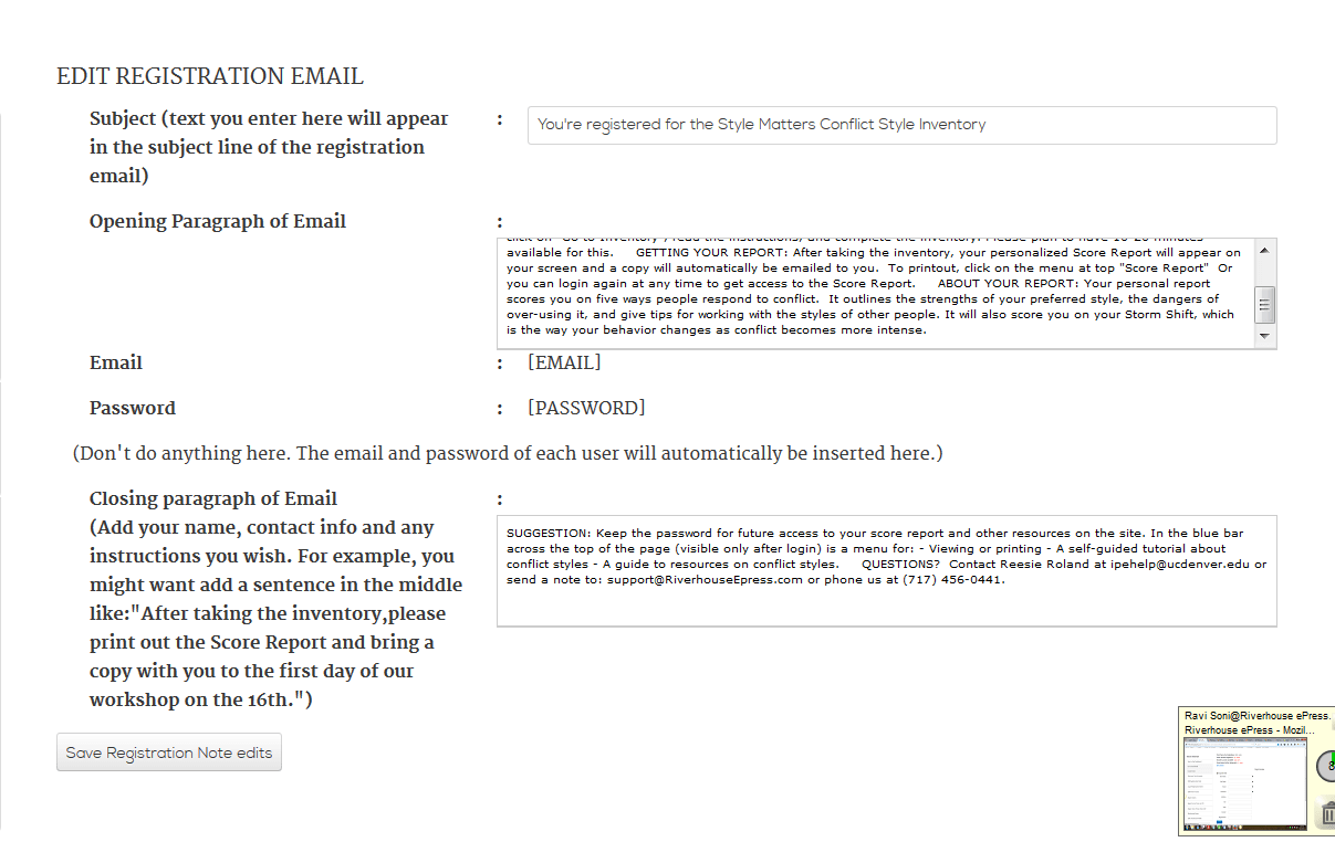 Send registration info to users with any instructions you wish to give them, with a single click. Users can then go to the inventory with a single click of a button contained in your email. They land on the first page of the inventor already logged in without having to enter their info themselves.