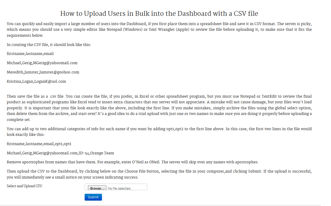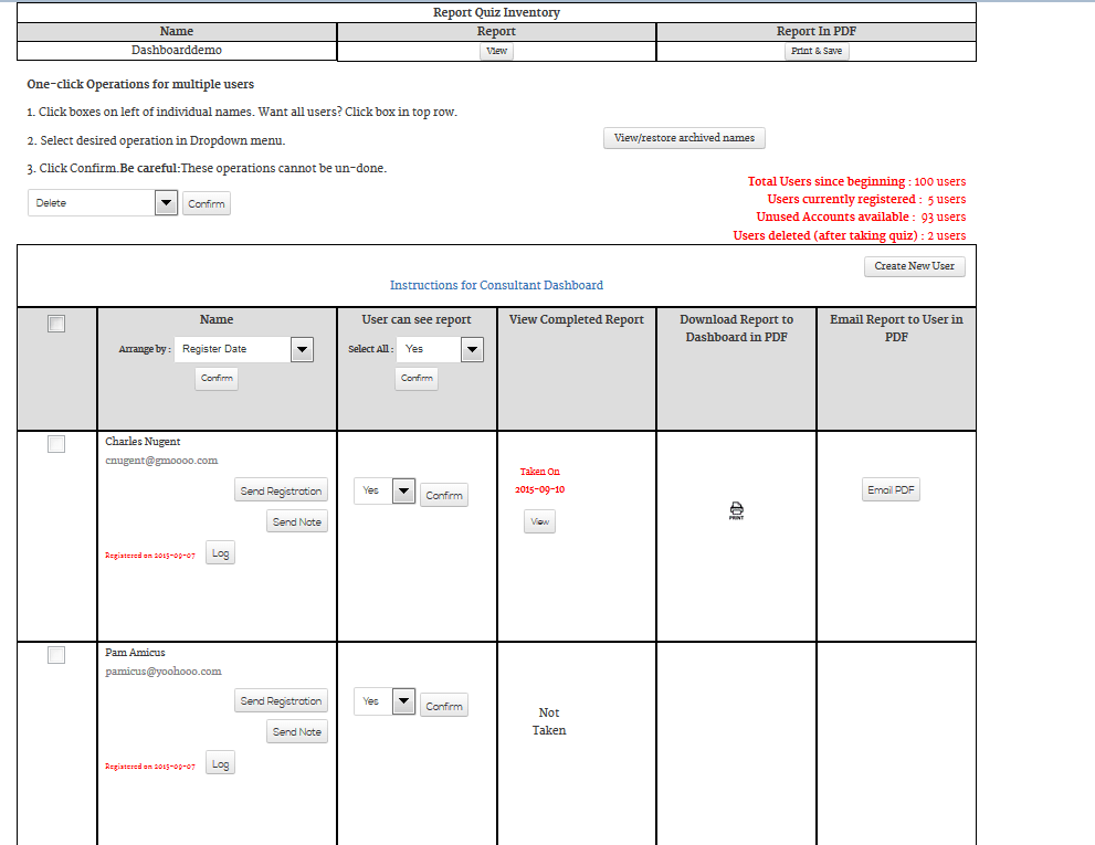 The Dashboard provides powerful user management tools for trainers by consolidating registration, communication, monitoring, and score review in one location.Trainers whose only need is to send login instructions to user for pre-paid access may prefer our Coupon Code access which requires no setup or entry of users names.